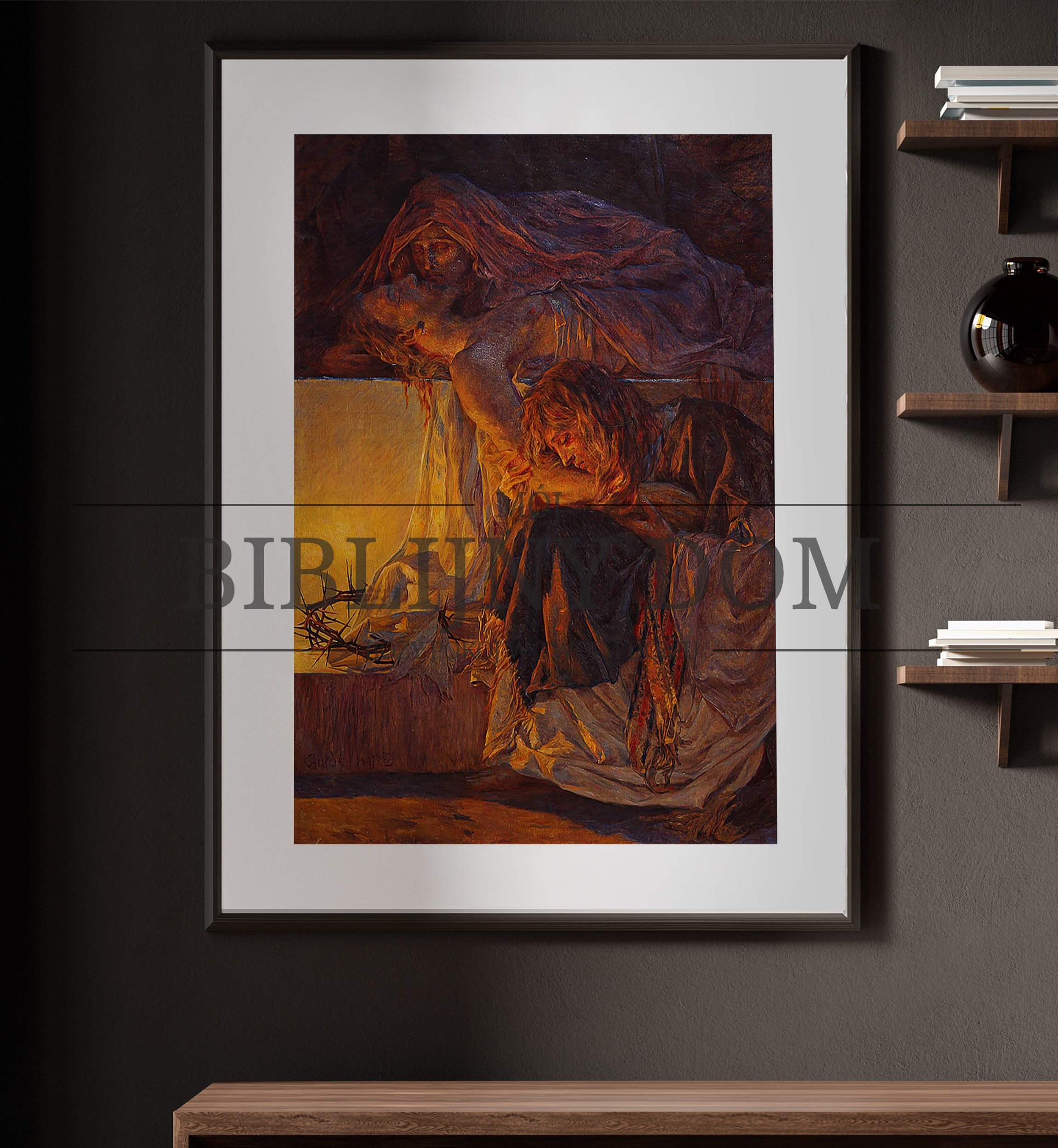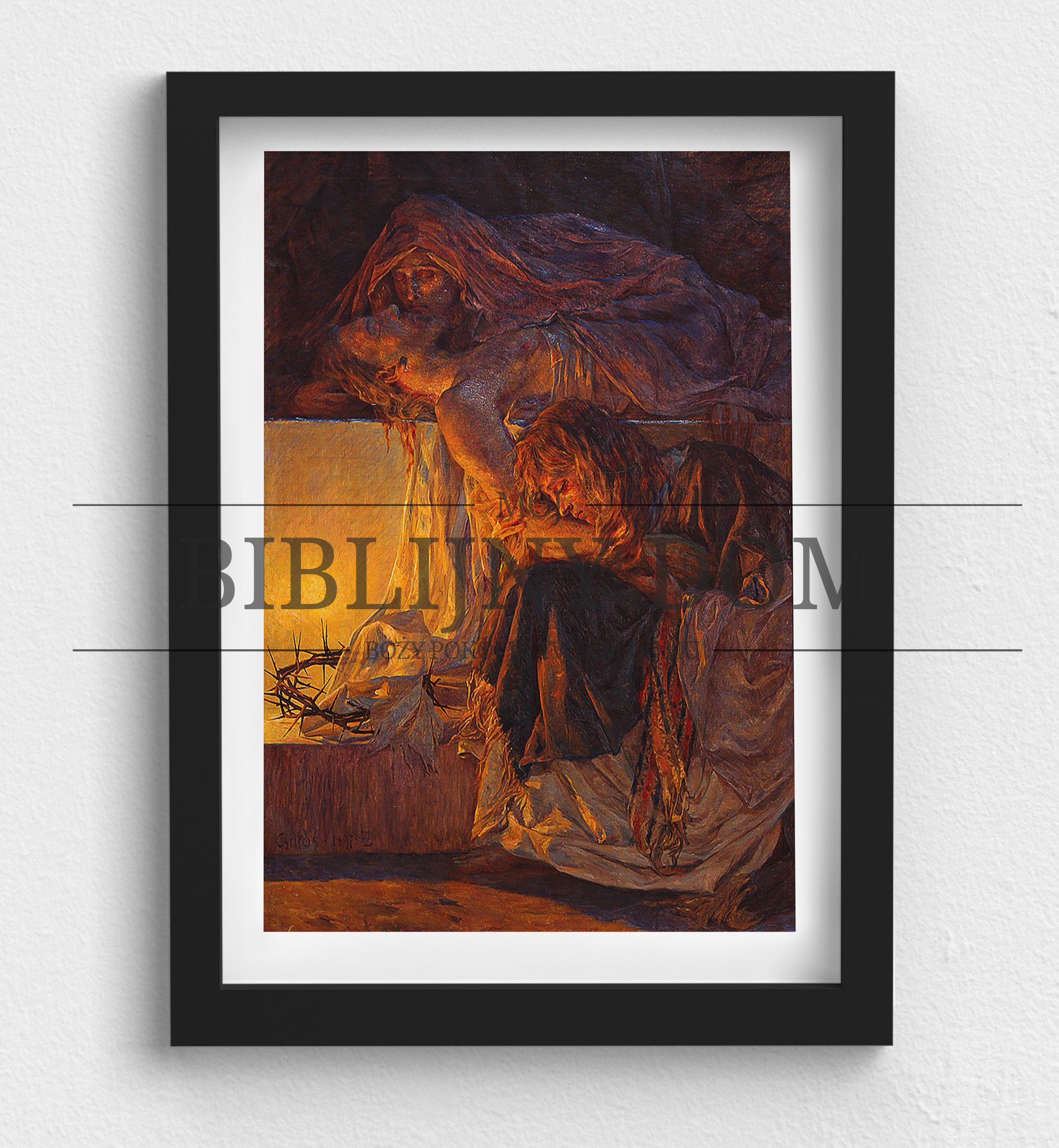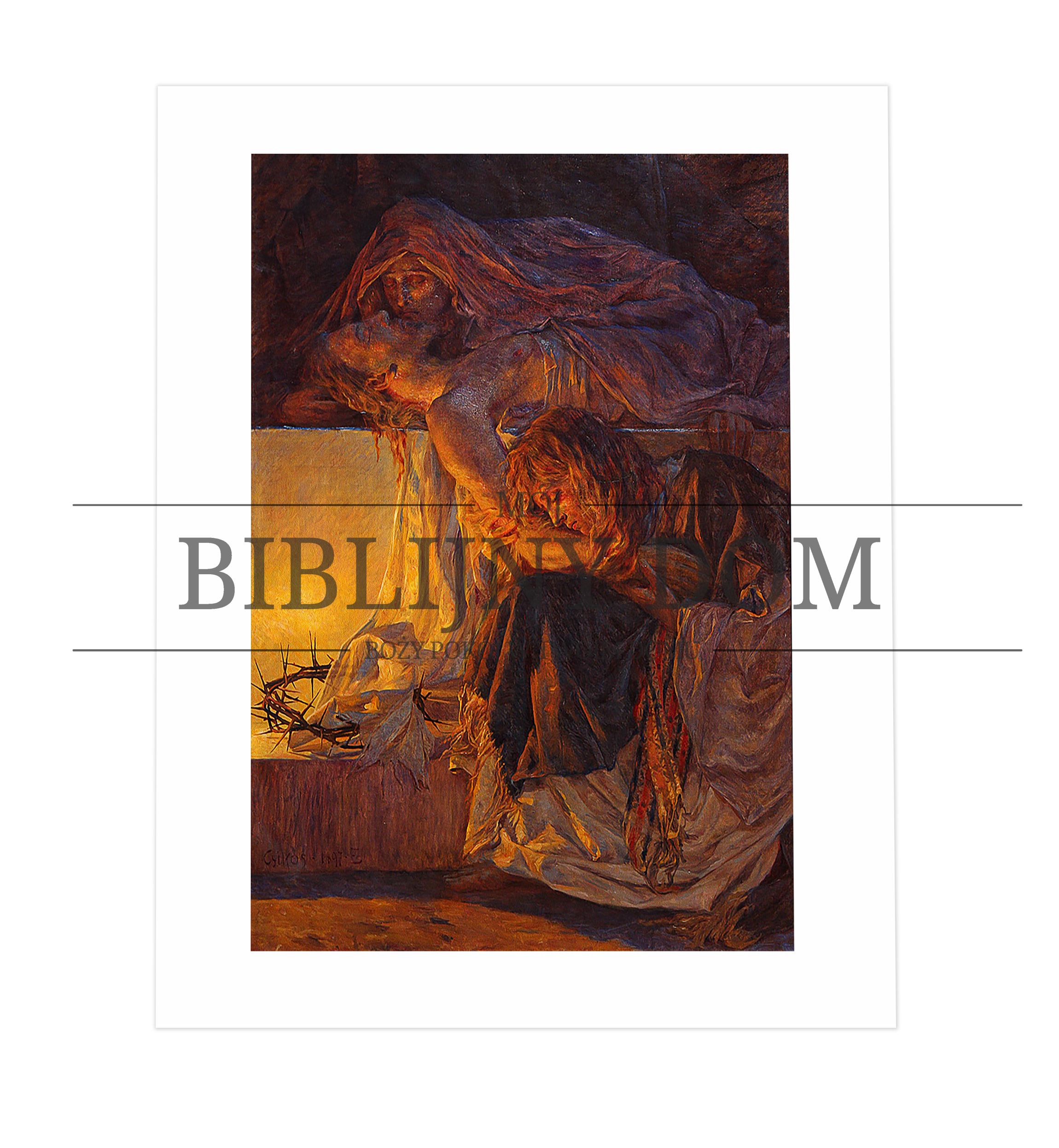 Matka Boża i Maria Magdalena tulą zdjęte z krzyża ciało Pana Jezusa.